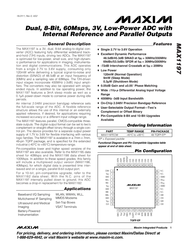 MAX1197 Dual, 8-Bit, 60Msps, 3V, Low-Power ADC with Internal Reference and Parallel Outputs