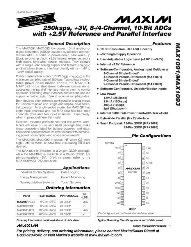 MAX1091, MAX1093 250ksps, +3V, 8-/4-Channel, 10-Bit ADCs with +2.5V Reference and Parallel Interface