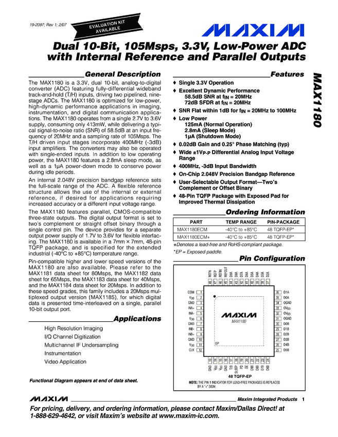 MAX1180 Dual 10-Bit, 105Msps, 3.3V, Low-Power ADC with Internal Reference and Parallel Outputs