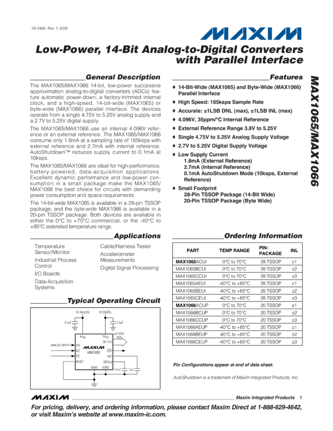 MAX1065, MAX1066 Low-Power, 14-Bit Analog-to-Digital Converters with Parallel Interface