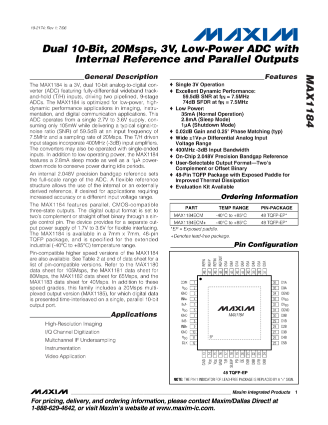 MAX1184 Dual 10-Bit, 20Msps, +3V, Low-Power ADC with Internal Reference and Parallel Outputs