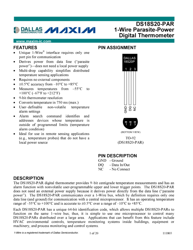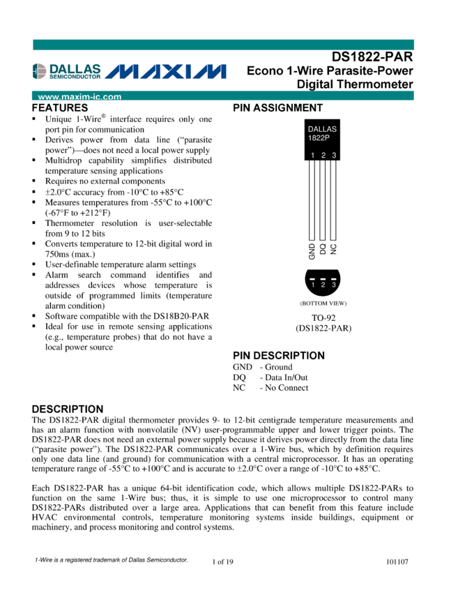 DS18B20-PAR 1-Wire Parasite-Power Digital Thermometer