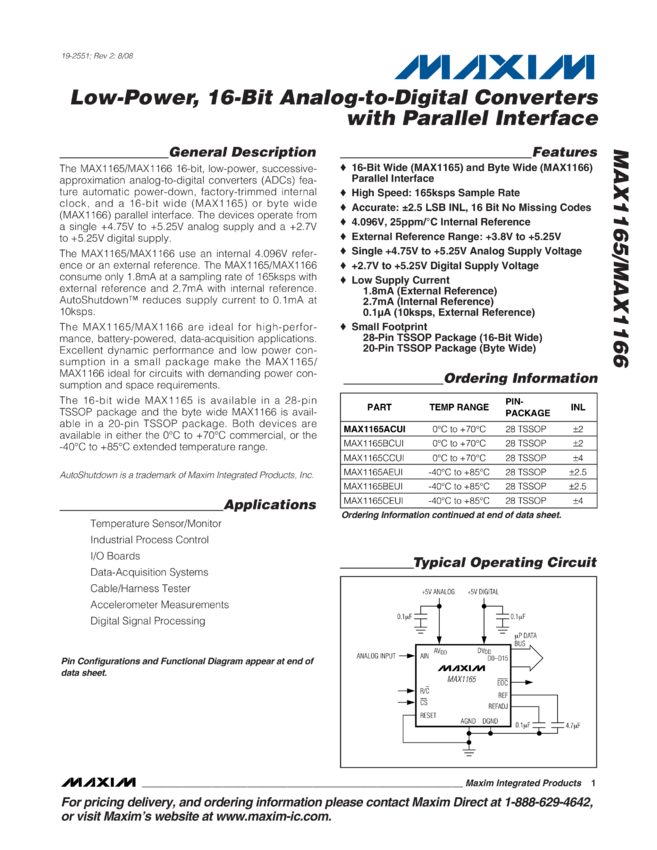 MAX1165, MAX1166 Low-Power, 16-Bit Analog-to-Digital Converters with Parallel Interface