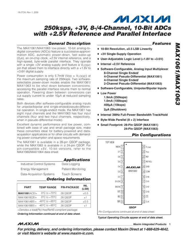 MAX1061, MAX1063 250ksps, +3V, 8-/4-Channel, 10-Bit ADCs with +2.5V Reference and Parallel Interface