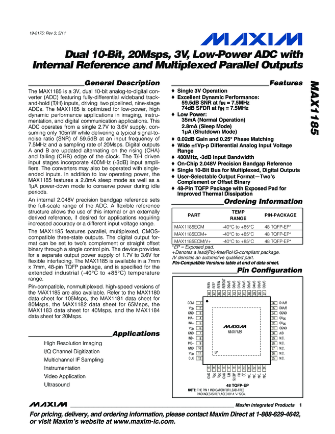 MAX1183 Dual 10-Bit, 40Msps, 3V, Low-Power ADC with Internal Reference and Parallel Outputs