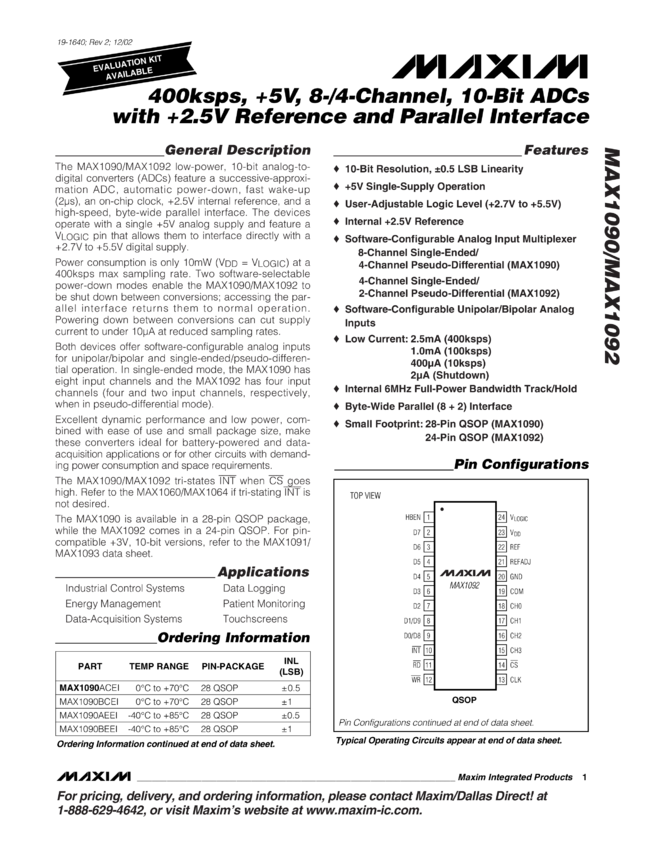 MAX1090, MAX1092 400ksps, +5V, 8-/4-Channel, 10-Bit ADCs with +2.5V Reference and Parallel Interface