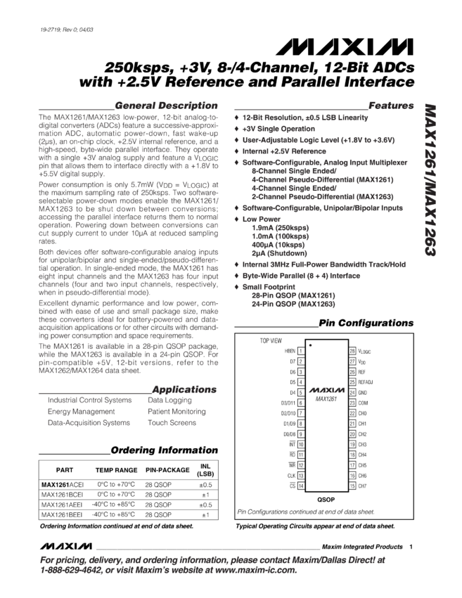 MAX1261, MAX1263 250ksps, +3V, 8-/4-Channel, 12-Bit ADCs with +2.5V Reference and Parallel Interface