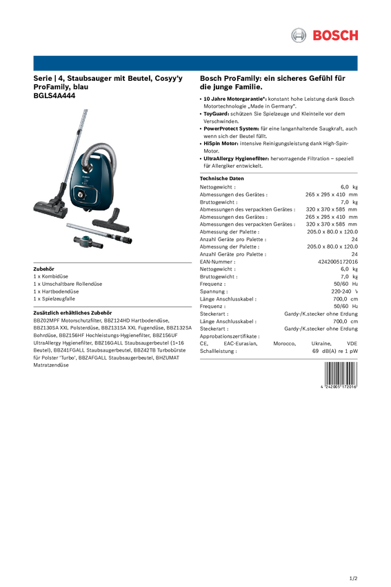 Bosch Haushalt BGLS4A444 Odkurzacz workowy 700 W zawiera ssawkę do parkietu