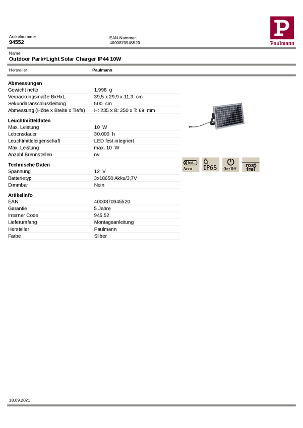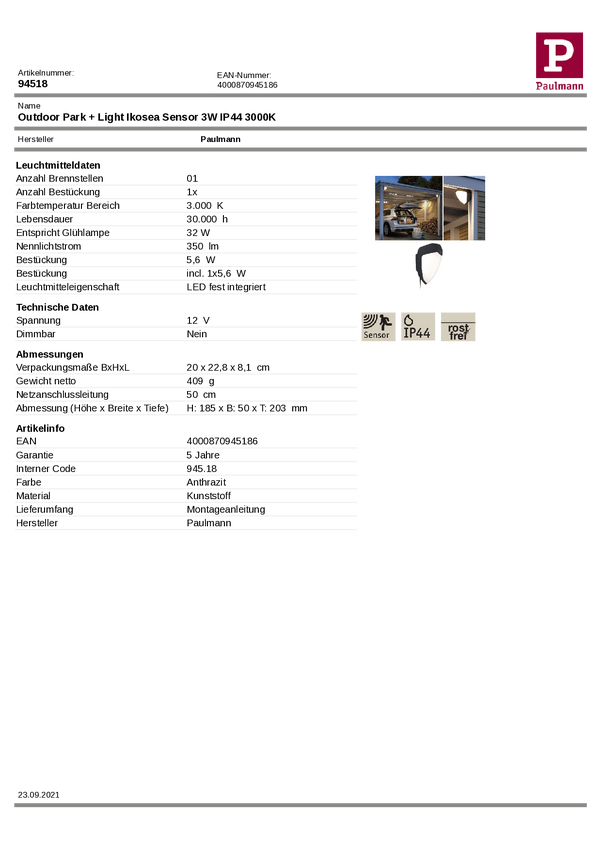 System oświetlenia wiaty garażowej Park + Light Paulmann 94552, 1 szt.