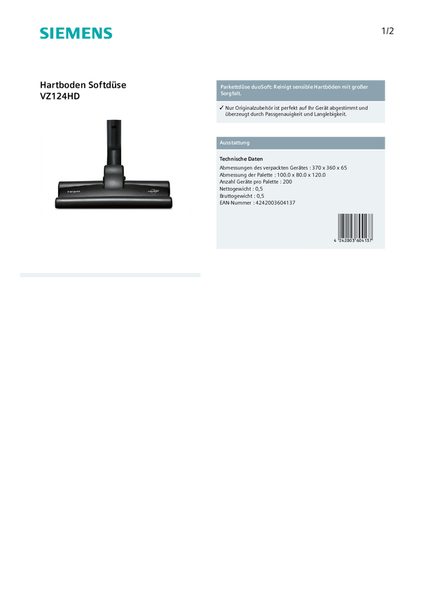 Ssawka do parkietu Siemens Hausgeräte VZ124HD 1 szt.
