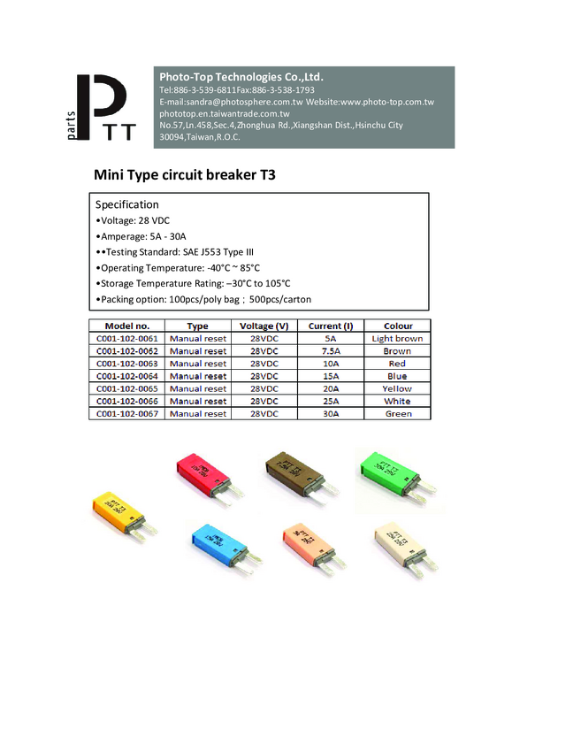 PARTS PTT C001-102-0063 Bezpiecznik nożowy samochodowy Circuit Breaker Mini, type 3. Manual Reset, 10A, 28 V, 10 A, 1 sz