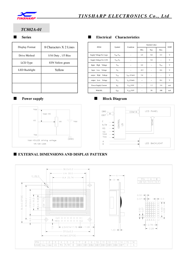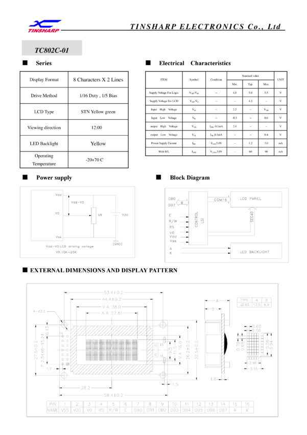 Matryca 8x2 znaków, z podświetleniem LED zółto-zielonym, STN Y/G, kierunek patrzenia , temp. pracy -20/+70C, ekran , TinSharp
