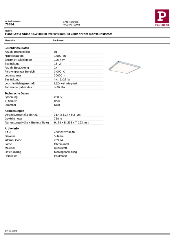 Lampa sufitowa LED Paulmann P Atria Shine 11,2W 3000K 190x190 ch m K 70993 11.2 W 1360 lm chrom (matowy)