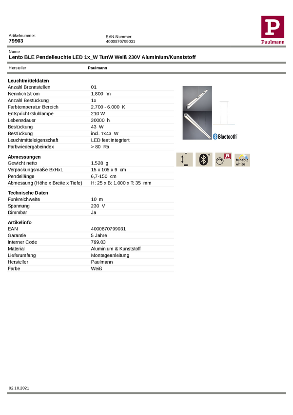 Lampa sufitowa, podwieszana Paulmann Lento BLE Pendell 79903 LED 10.75 W biały 3570 lm