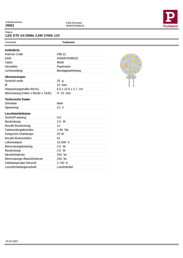 Żarówka LED Paulmann 28811 G4 2.5 W = 25 W 250 lm ciepła biel 1 szt.