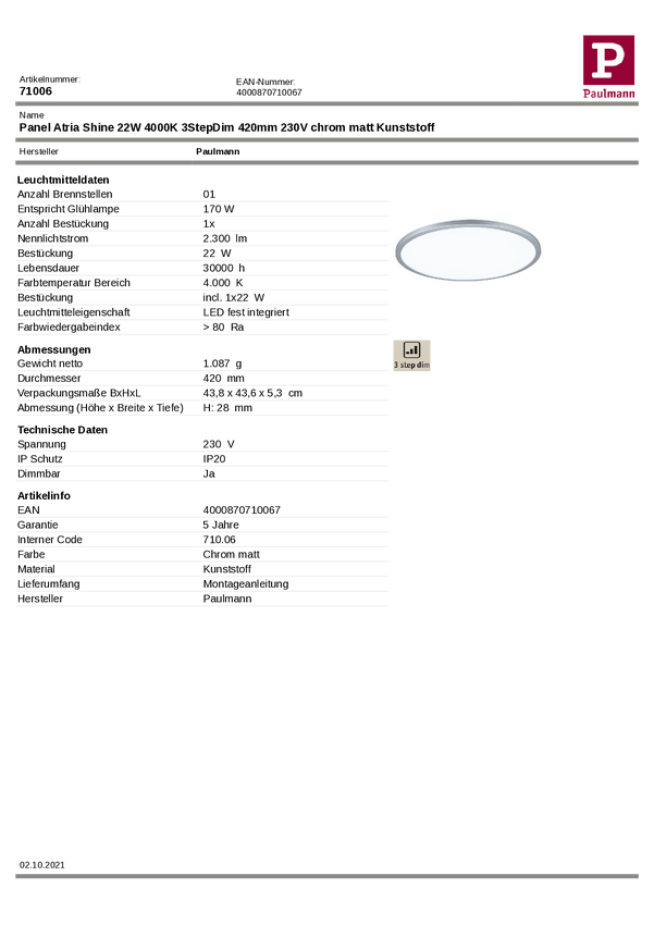 Lampa sufitowa LED Paulmann P Atria Shine 11,2W 3000K 190mm ch mt Ks 70990 11.2 W 1340 lm chrom (matowy)