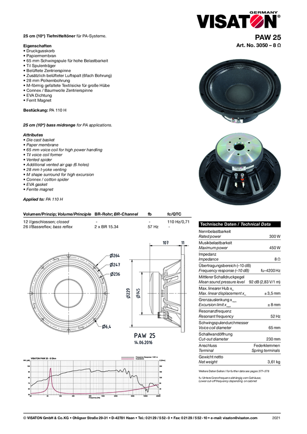 Głośnik nisko-średniotonowy Visaton PAW 25 - 8 Ohm