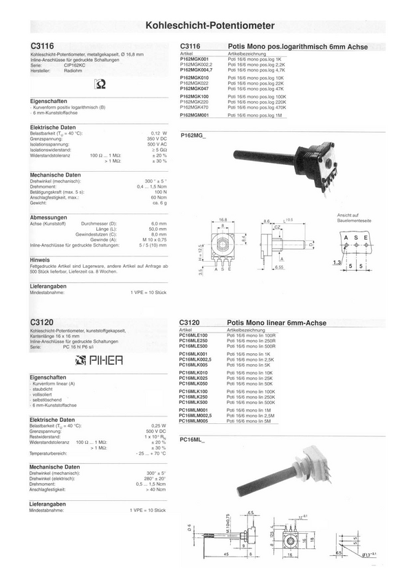 Potencjometr mono Piher PC16SH-10IP06102B2020MTA, 1 kOhm, 0,1 W, O 6 mm, + 20 %