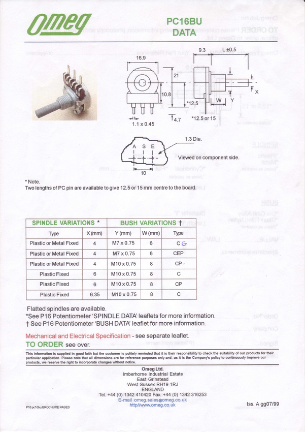 Potencjometr obrotowy OMEG PC16BU 1K A F21 CGW