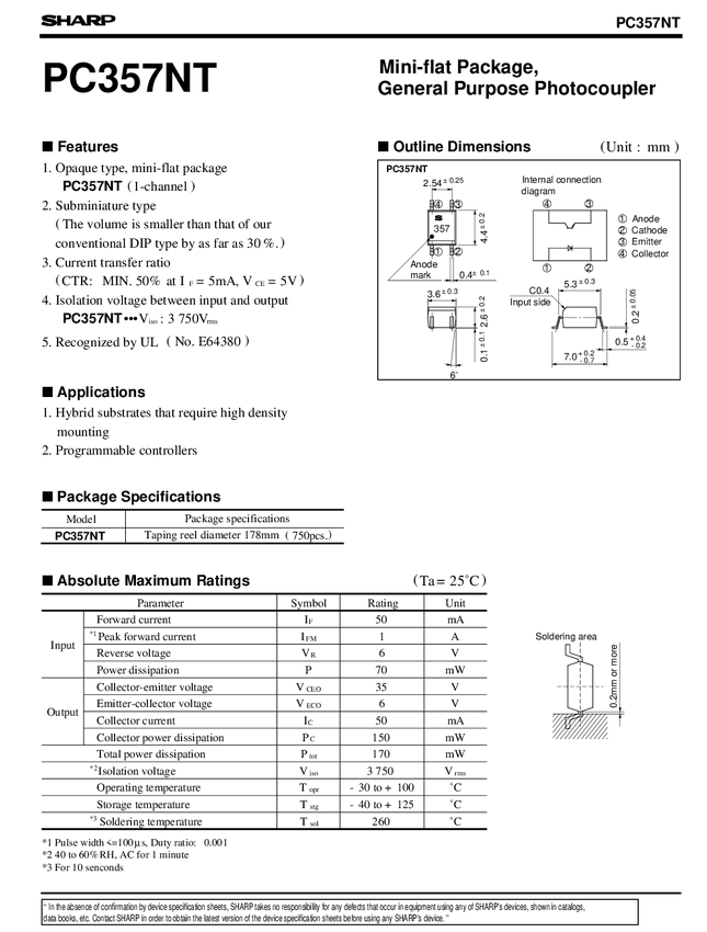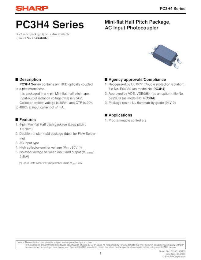 SOP4, AC/DC Optocoupler, Vce 70V, CTR 100-250%