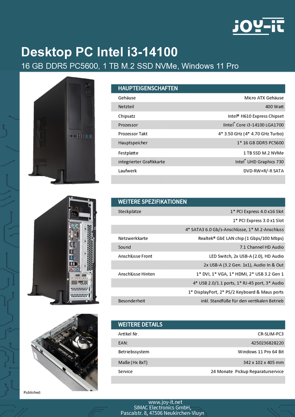 Joy-it Komputer PC stacjonarny CR-SLIM-PC3 Intel® Core™ i3 i3-14100 16 GB RAM 1 TB SSD Intel Grafika UHD 730 Win 11 Pro