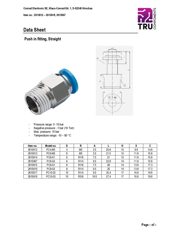 TRU COMPONENTS Łącznik prosty PC4-M3C Średnica rury: 4 mm Rozmiar gwintu: M3 x 0.50 1 szt.