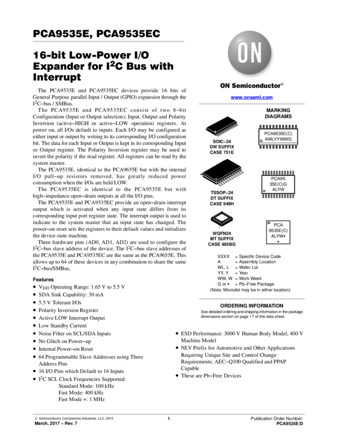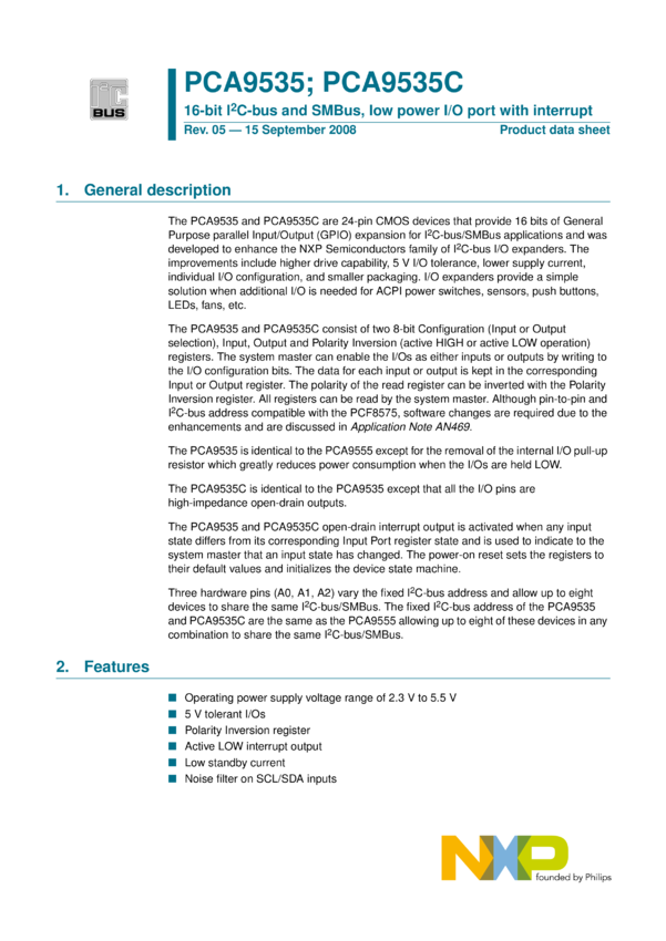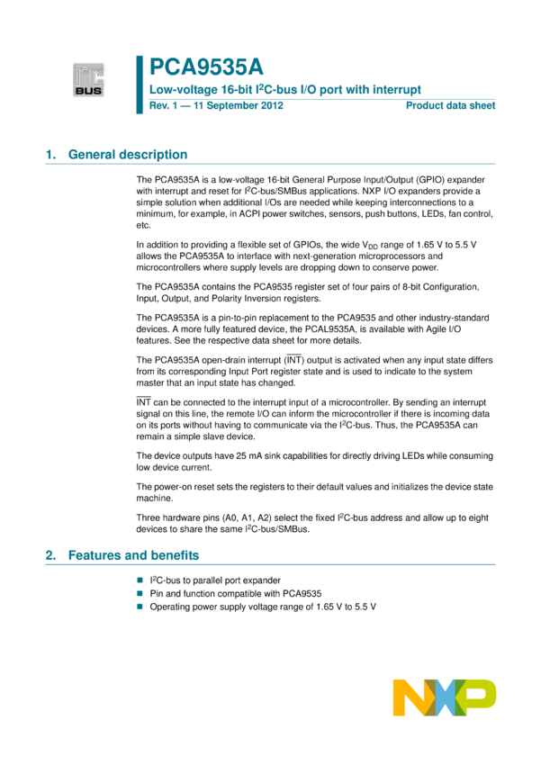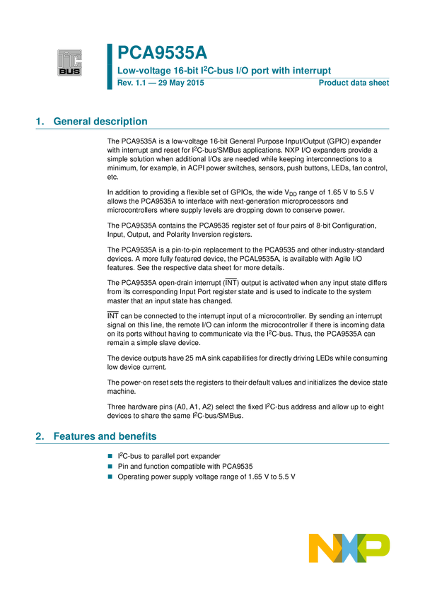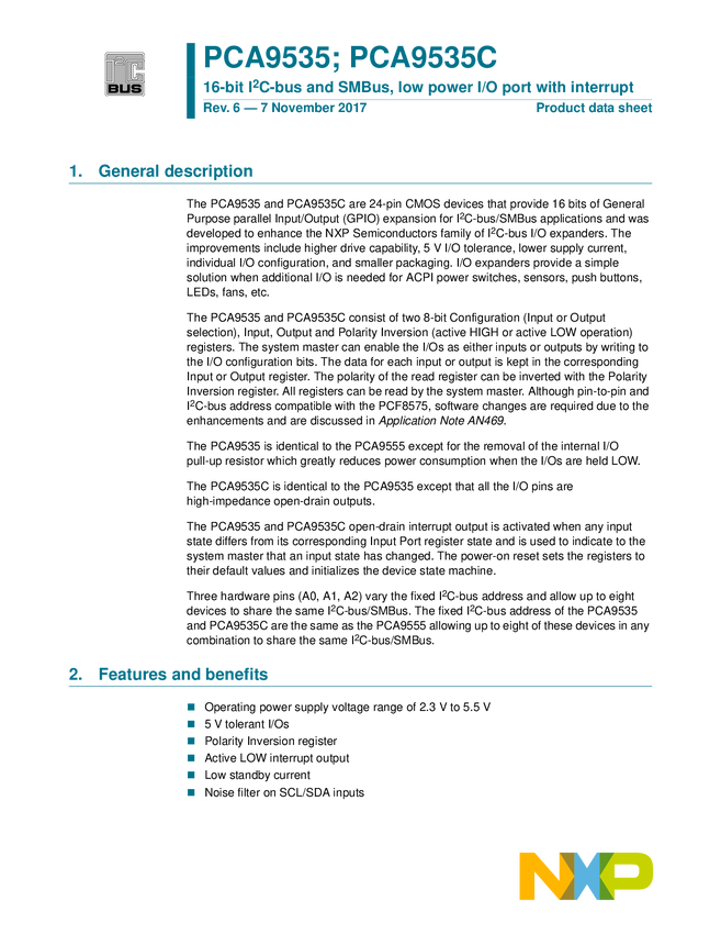16-bit I2C-bus and SMBus, low power I/O port with interrupt