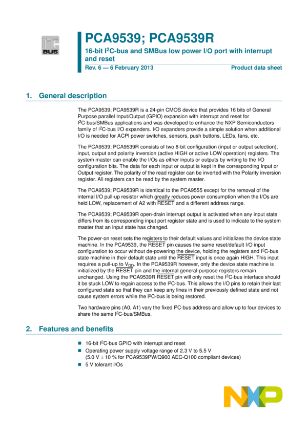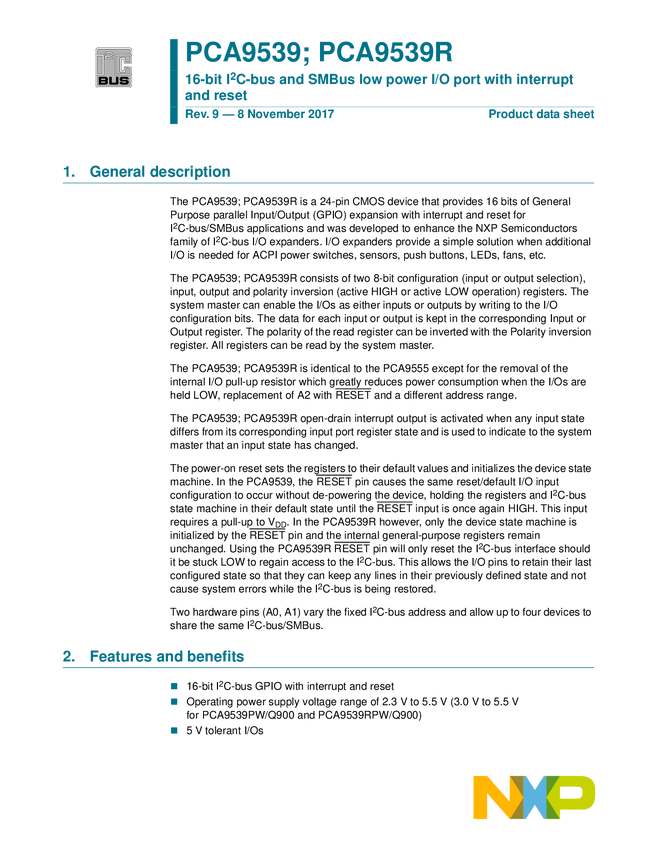 Low voltage 16-bit I2C-bus I/O port with interrupt and reset