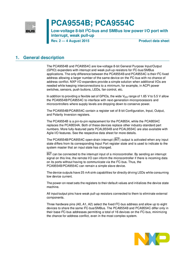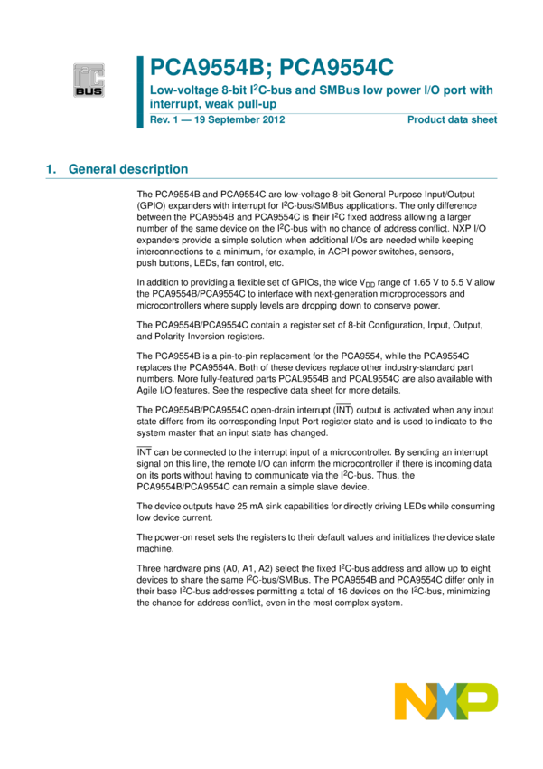 Low-voltage 8-bit I2C-bus and SMBus low power I/O port with interrupt, weak pull-up