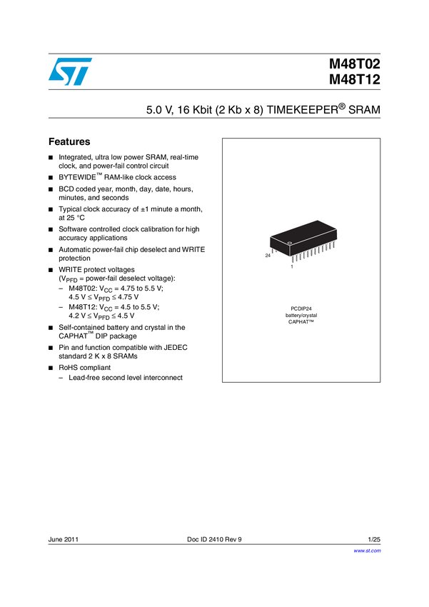 Układu scalony Czas / Zegar RTC STMicroelectronics M48T12-70PC1 Zegar / Kalendarz PCDIP-24