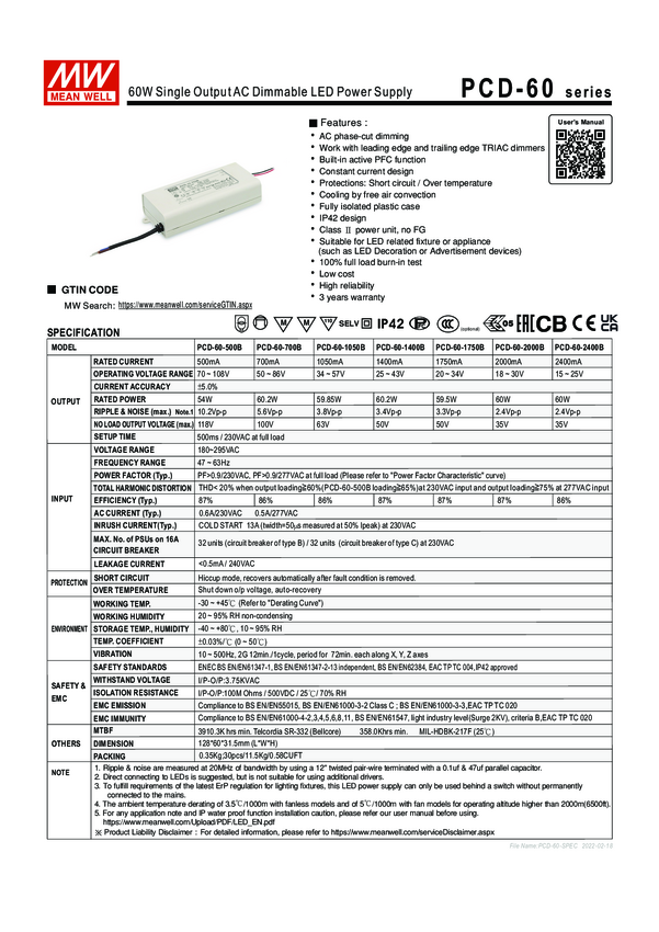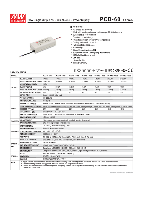 MEAN WELL PCD-60-1750B Sterownik LED Stałonaprądowy 60 W 1.75 A 20 - 34 V/DC Ściemniacz, Układ PFC, Zabezpieczenie przed