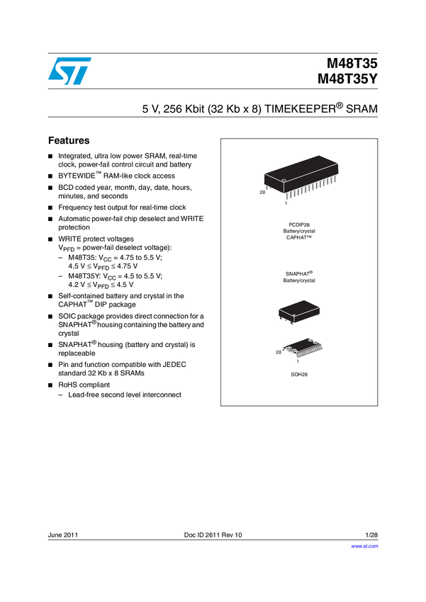 Zeropower RAM PCDIP28 256 Kbit ( 32Kbit x 8) 70 ns Write protect Voltage 4,2-4,5 V; VCC = 4,5-5,5V wersja M48Z35Y-70PC1 990k9 v6 mys99220a date code 2012 20 W przypadku gdy tego modelu nie ma proponujemy N48Z35-70PC1