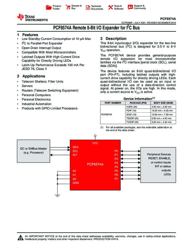 Remote 8-bit I/O expander for I2C‑bus with interrupt