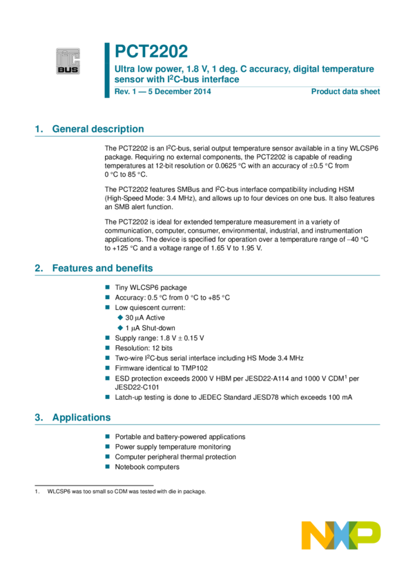 Ultra low power, 1.8 V, 1 deg. C accuracy, digital temperature sensor with I2C-bus interface