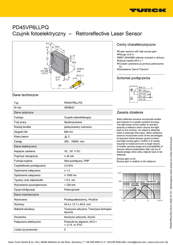 Fotokomórka refleksyjna laserowa Turck PD45VP6LLPQ 3058622 1 szt.