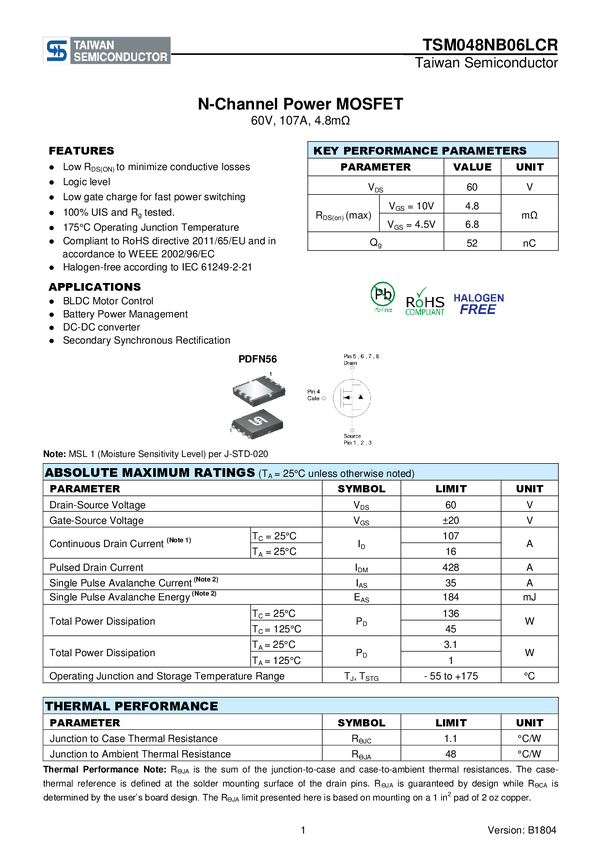N-Ch 60 V 107 A 136 W 0,0048R PDFN56 Taiwan Semiconductor TSM048NB06LCR RLG N/A N/A TSM048NB06LCR RLG