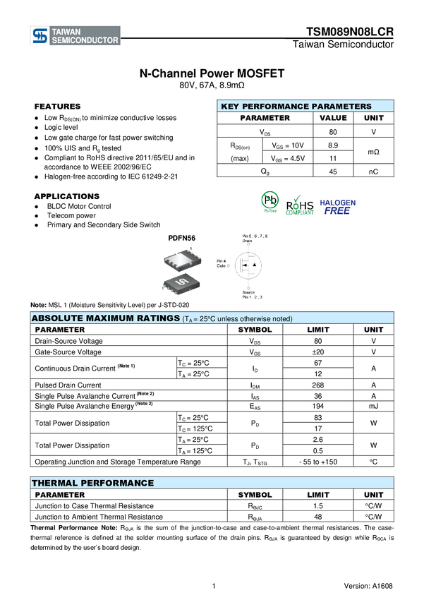 N-Ch 80 V 67 A 83 W 0,0089R PDFN56 Taiwan Semiconductor TSM089N08LCR RLG N/A N/A TSM089N08LCR RLG