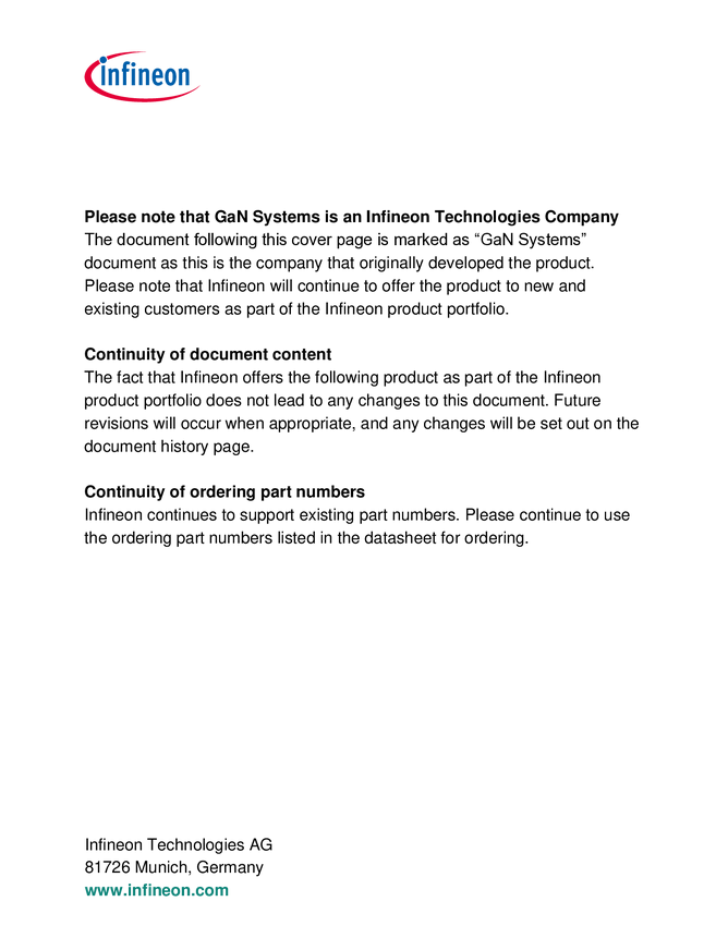 CoolGaN™ Transistor 650 V ≤ G3 for ultimate efficiency and reliability The GS-065-030-2-L-TR is an enhancement mode GaN-on-Silicon power transistor. The properties of GaN allow for high current, high voltage breakdown and high switching frequency. The GS-065-030-2-L-TR is a bottom-side cooled transistor in a 8x8 mm PDFN package that enables ideal power disspation as required in high power server and data center power supplies and industrial use power applications.