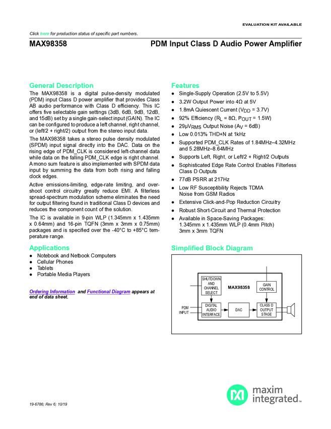MAX98358 PDM Input Class D Audio Power Amplifier