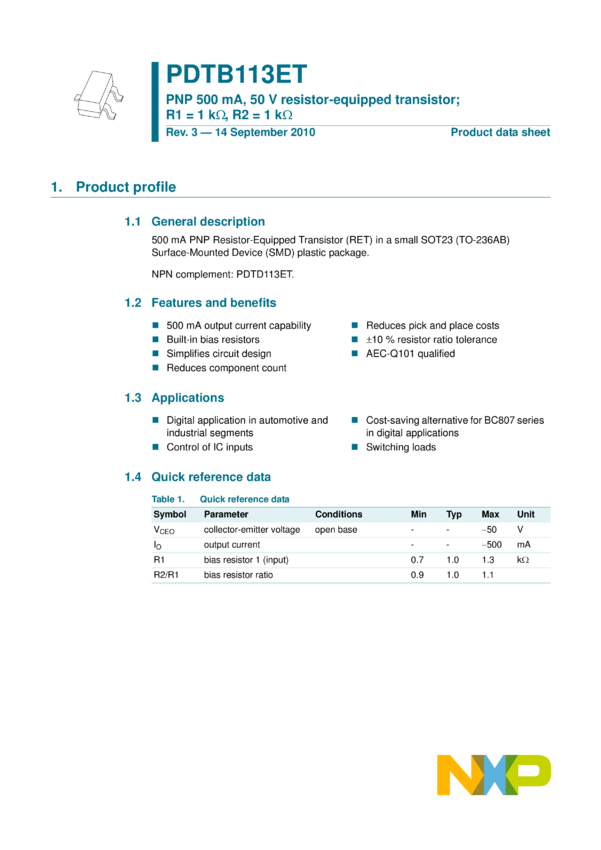 PNP 500 mA, 50 V resistor-equipped transistor; R1 = 1 kOhm, R2 = 10 kOhm