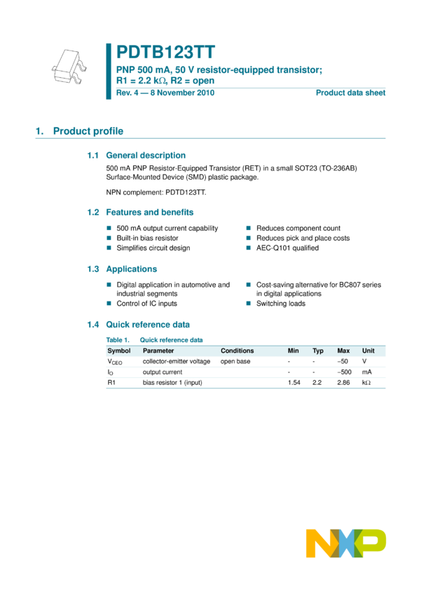 PNP 500 mA, 50 V resistor-equipped transistor; R1 = 2.2 kOhm, R2 = open