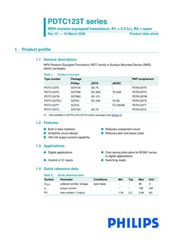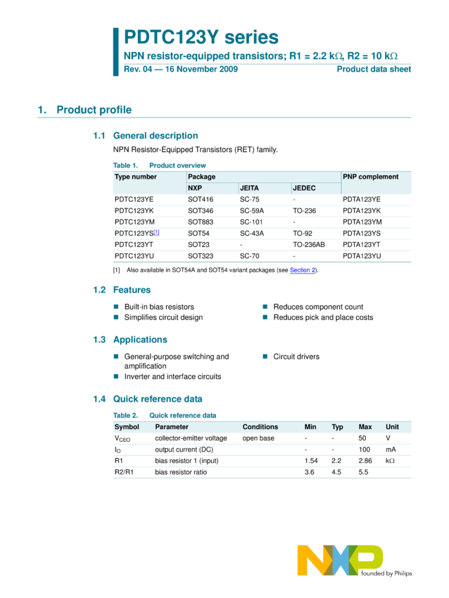 NPN resistor-equipped transistors; R1 = 2.2 kΩ, R2 = 47 kΩ