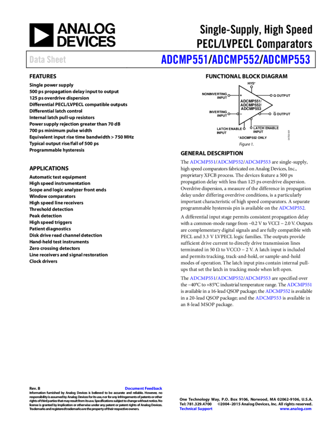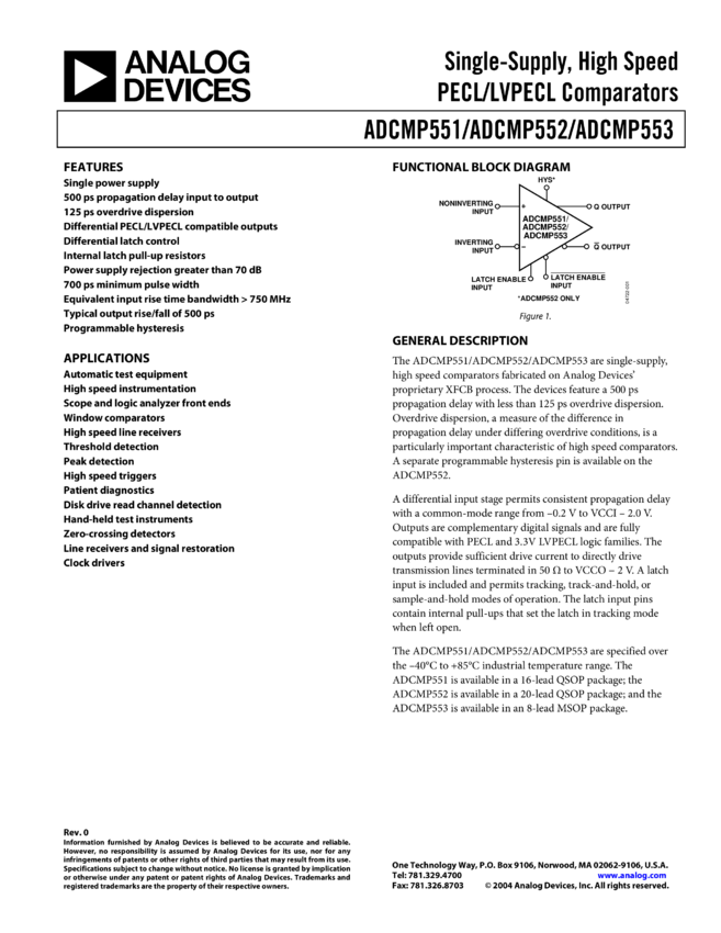 ADCMP553: Single - Supply, High Speed PECL Comparator in an 8-lead MSOP Package