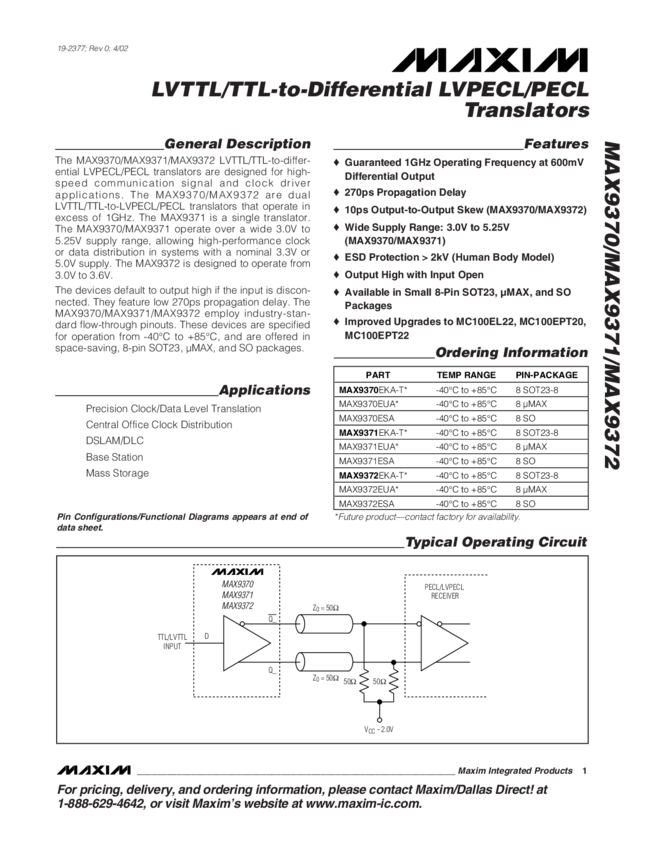 MAX9372 LVTTL/TTL-to-Differential LVPECL/PECL Translator