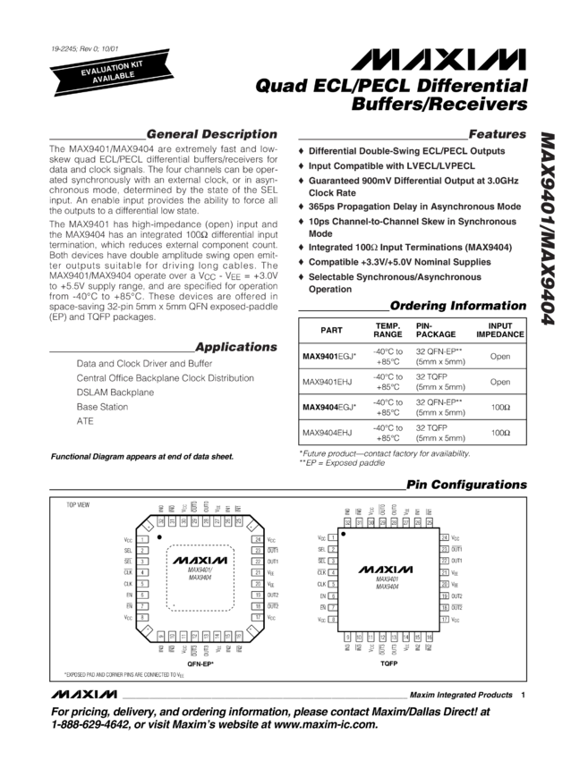 MAX9401, MAX9404 Quad ECL/PECL Differential Buffers/Receivers