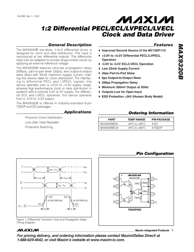 MAX9320B 1:2 Differential PECL/ECL/LVPECL/LVECL Clock and Data Driver