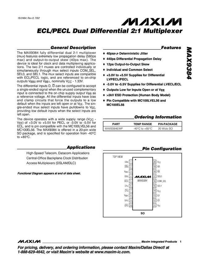 MAX9384 ECL/PECL Dual Differential 2:1 Multiplexer