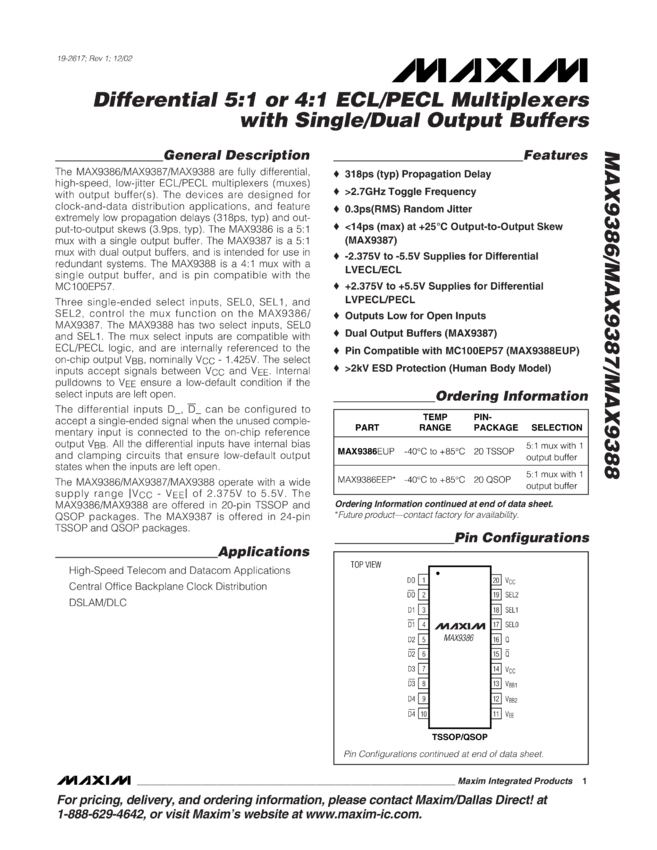 MAX9386, MAX9387, MAX9388 Differential 5:1 or 4:1 ECL/PECL Multiplexers with Single/Dual Output Buffers