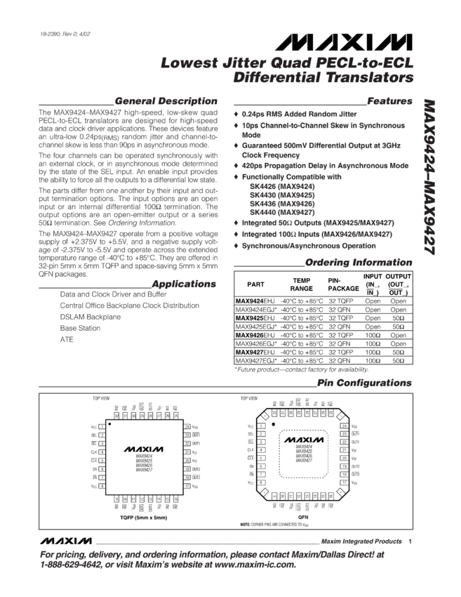 MAX9424, MAX9425, MAX9426, MAX9427 Lowest Jitter Quad PECL-to-ECL Differential Translators