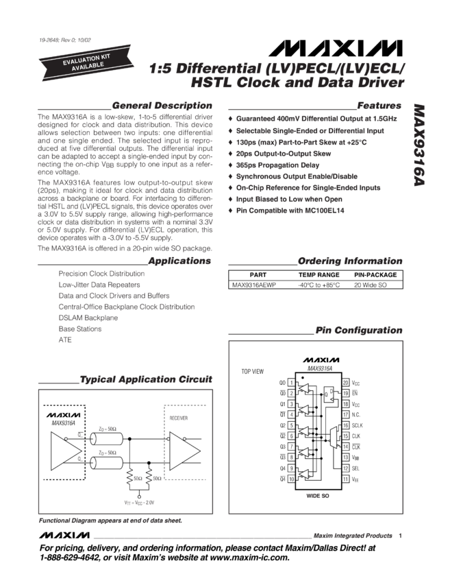 MAX9316A 1:5 Differential (LV)PECL/(LV)ECL/HSTL Clock and Data Driver